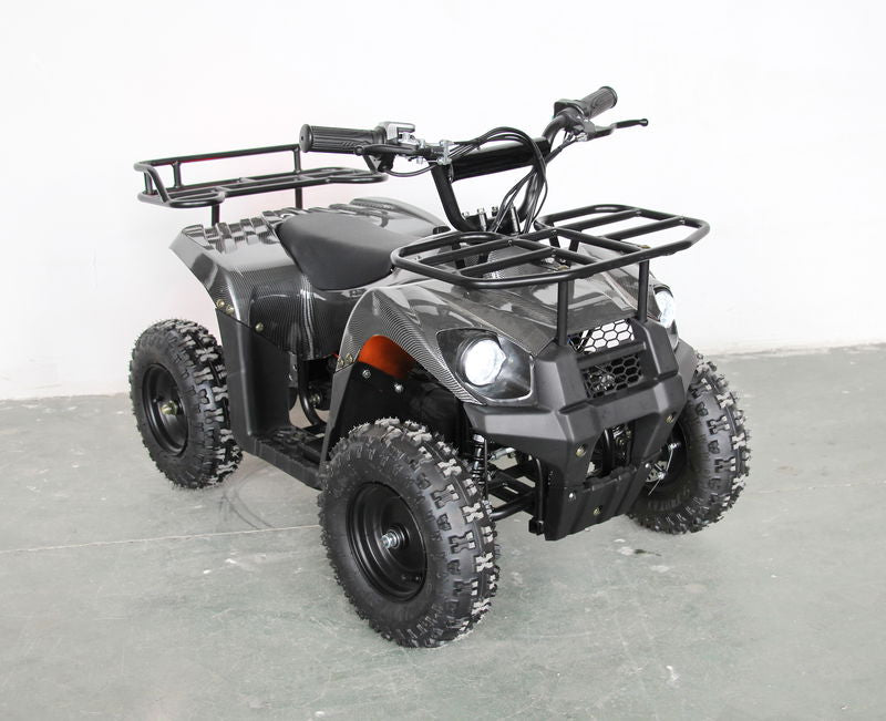 ATV electric 36V 1000W cu motor cu perii. Cadru metalic, roți gonflabile, acumulatori plumb-acid 36V 12Ah, faruri luminoase, sistem de alarmă, greutatea maximă suportată – 90 kg. Articol RTM56